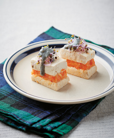4. 두부 사이에 속을 넣은 뒤 먹기 편한 크기로 자른다.