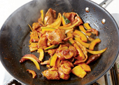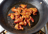 4. 팬에 올리브유를 두르고 재운 돼지고기와 된장육수(50g)를 넣고 볶는다.