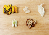 3. 단호박은 도톰하게 썰고, 죽순, 양파는 채 썰고, 대파는 어슷 썰고, 마른 표고버섯은 불린 뒤 먹기 좋은 크기로 썬다.