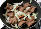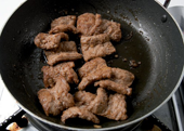 4. 들기름을 두른 팬에 다진 파와 마늘, 생강을 넣고 약한 불에 볶다가 콩고기를 넣고 나머지 양념장을 뿌려 볶는다.