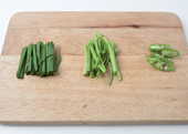 3. 부추와 미나리는 양파와 비슷한 길이로 썰고, 청양고추는 어슷 썬다.