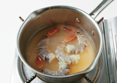 4. 팬에 닭육수(100g)와 유자청과 매실액을 넣고 끓이다가 잘 섞이면 대하를 넣어 조린다.