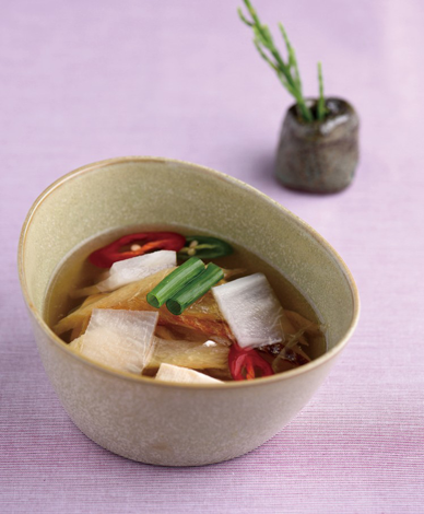 5. 만들어진 국물에 함초와 대파뿌리를 건져내고 어간장으로 간을 해준다. 국물을 만들고 남은 무는 나박썰기 해서 국에 넣어준다.