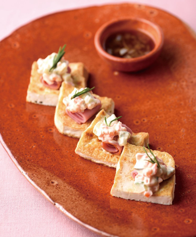 6. 두부를 한입 크기로 잘라준 후 슬라이스햄과 샐러드를 올려 소스랑 함께 완성한다.