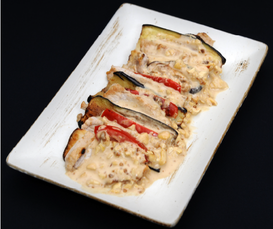 6. 팬이 따끈해지면 양념한 돼지고기를 구워 접시에 담고 그 위에 된장 소스를 올리고, 구워낸 채소를 다시 위에 올려 완성한다.