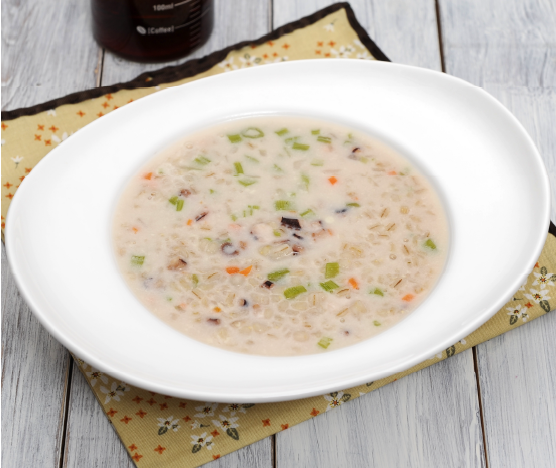 6. 냄비에 육수를 넣고 나무주걱으로 은근히 저어가면 끓이다가 죽이 어우러 지면, 우유와 치즈, 간장을 살짝 넣고 한 번 더 끓여 완성한다.