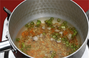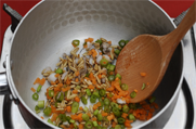 5. 냄비에 참기름을 두르고, 주꾸미를 먼저 볶다가 불린 보리쌀을 넣고 다시 볶은 뒤 썰어놓은 채소(④)를 넣는다.