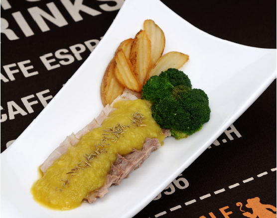 6. 팬에 오렌지즙과 설탕, 정종, 소금을 넣고 바글바글 졸인 후 와사비를 넣어 소스를 만들고, 오븐에 구어진 삼겹살을 잘라 접시에 담고 그 위에 소스를 살짝 올리고, 한쪽에는 감자튀김(②), 고구마무스(③), 브로컬리(⑤)를 곁들여 완성한다.