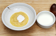 3. 삶아진 고구마를 으깨어 생크림을 넣어 골고루 섞는다.