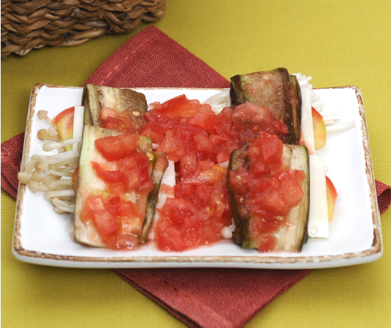 6. 구운 가지위에 토마토와 모짜렐라치즈를 올려 팬에 굽고, 별도로 팽이버섯에 후춧가루를 뿌려 살짝 구워 접시에 담고, 끓여 놓은 토마토소스를 올려 완성한다.