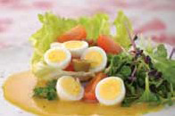 6. 접시에 준비한 양상추를 볼처럼 놓고, 그 안에 메추리알, 올리브, 방울토마토를 담고 잎채소를 곁들 이고 머스터드 드레싱을 뿌린다.c