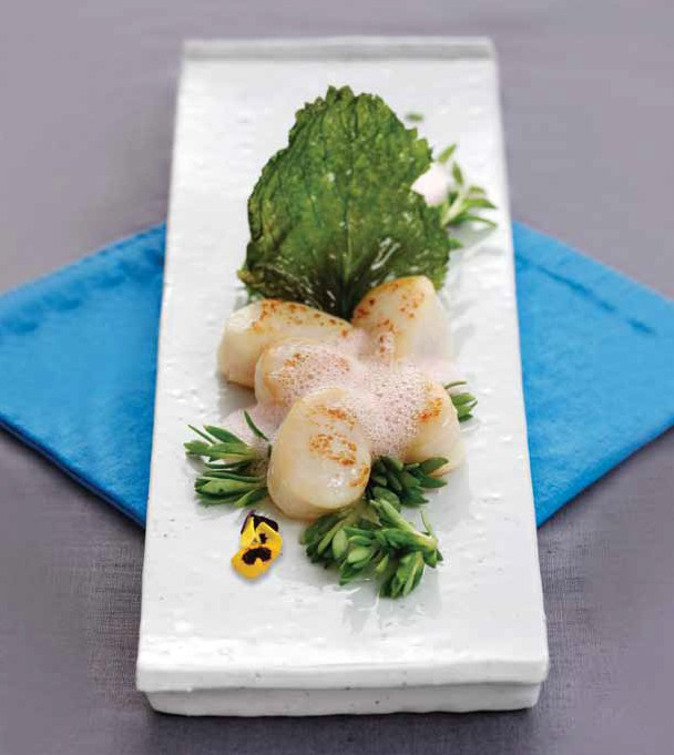 7. 접시에 돌나물을 깔고 구운 관자 를 담고 그 위에 깻잎오일을 살짝 뿌린뒤 석류거품을 얹는다. 튀긴 깻잎과 식용 꽃으로 장식한다