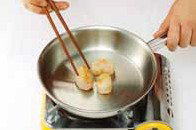 3. 튀김 팬에 올리브유를 부어 젓가 락을 세워 보아 주위로 기름이 끓 어오르면 깻잎을 넣어 바삭하고 투명하게 튀긴 후 깻잎과 팬에 남 은 깻잎오일은 그릇에 따로 담아 놓는다.