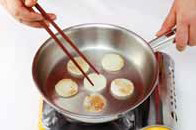 5. 달군 프라이팬에 올리브유를 두르 고 중간 불로 마를 노릇하게 구운 다음 호박고구마도 노릇하게 굽는 다.b