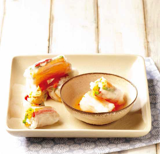 지단 50g, 당근 40g(1/4개), 라이스페이퍼 40g(5장), 동태살 120g(1/4마리), 양상추 40g(6장), 양파 40g(1/3개), 파프리카 40(1/2개), 청피망 40g(1/2개) 소스