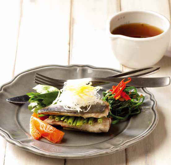 9. 고명으로 시금치와 토마토를 올리고 소스를 끼얹은 후 그 위에 파, 생강, 홍고추, 레몬제스트, 미나리 잎을 섞어 소복하게 얹어 완성한다.