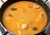 5. 코코넛 밀크와 생크림, 파프리카, 양송이버섯을 넣어 살짝 더 끓인다.