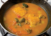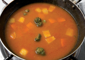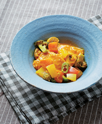 4. 당근, 양파, 고구마를 넣어 볶다가 브로콜리와 치킨스톡, 카레가루, 강황가루을 넣어 잘 섞어 끓인다.