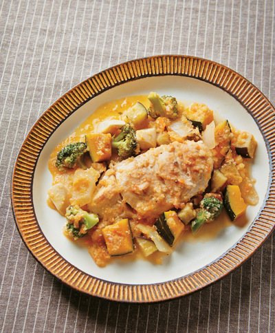 6. 단호박과 브로콜리, 양파, 가지를 센 불에서 빠르게 볶은 뒤 닭고기와 타콤소스를 넣어 조리다가 닭고기가 다 익으면 접시에 담고, 파슬리가루를 뿌려 마무리.