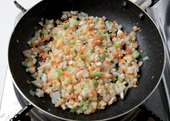 4. 팬에 식용유를 두르고 다진 마늘을 먼저 볶다가 양파와 셀러리, 당근을 넣어 볶고, 양파가 투명하게 변하면 사과와 버섯을 넣어 볶는다.
