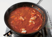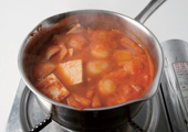 5. 육수에 토마토채소소스를 넣어 끓인 후, 마지막으로 두부를 넣어 약 2분 정도 끓인다.