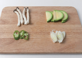 2. 버섯은 잘게 찢고, 애호박은 반달모양으로 납작 썰고, 고추와 대파는 어슷하게 썬다.