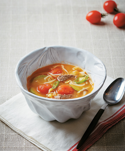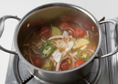 5. 육수(300g), 콩나물, 쇠고기, 느타리버섯, 애호박을 넣고 국간장과 소금으로 간해 끓인다.