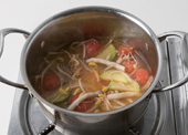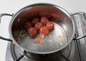 4. 냄비에 식용유(10g)를 두른 뒤 다진 마늘을 넣고 볶아 향을 낸 뒤 방울토마토를 넣고 볶는다.