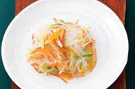 4. 실곤약, 오이, 사과, 당근, 빨강 파프리카에 유자 드레싱을 섞어 버무린다.c