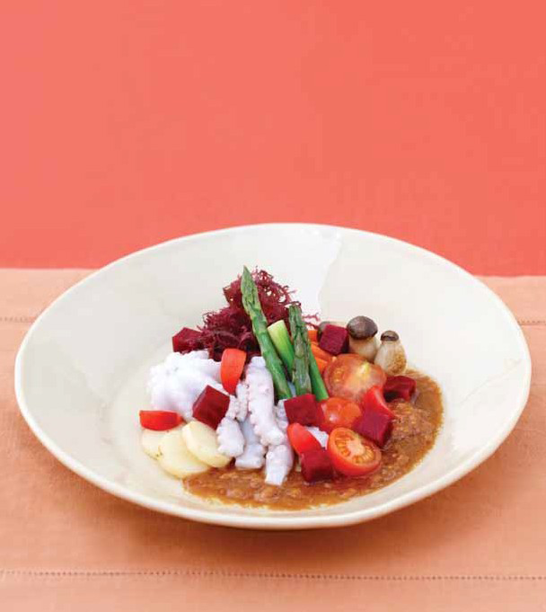 10. 그릇에 라디치오를 놓고 그 위에 감자, 낙지, 새송이버섯, 아스파라거스, 당근을 담고 절여 놓은 비트, 래디쉬를 올리고 보리된장 비네그레트 소스를 곁들인다.