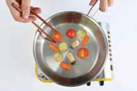 9. 달궈진 프라이팬에 올리브유를 두르고 감자를 먼저 익힌 후 당근, 미니새송이버섯, 방울토마토를 넣어 익힌다.c