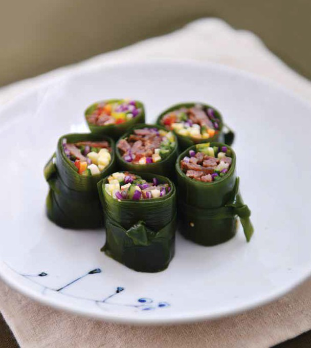 쇠고기사태살 100g, 쌈다시마 2장, 게맛살 30g, 고구마 20g(5×3×2cm), 마 20g(5×3×2cm), 빨강 파프리카 20g(1/7개), 노랑 파프리카 20g(1/7개), 당근 20g(5×3×2cm), 오이 20g(2cm), 적양배추 50g, 마른표고버섯 10g(1장),