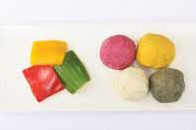 3. 밀가루를 체에 친 다음 4등분으로 나눈 후 밀가루, 3종류의 파프리카 즙을 이용해 총 4종류의 반죽을 만들고 밀봉하여 30분 정도 숙성 시켜 준비한다.a