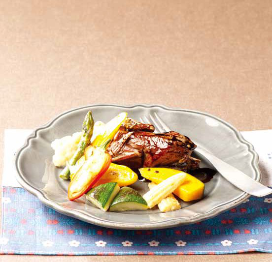 10. 접시 위에 메추라기와 구운 미니파프리카, 영콘, 마, 당근, 애호박, 단호박, 아스파라거스, 망고를 담고 홍삼소스를 곁들인다.