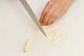 4. 더덕을 4cm로 자른 뒤 돌려 깎아 넓게 펴고 두드린 뒤 전분가루를 묻힌다.b