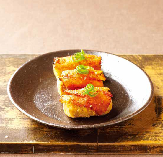 6. 더덕 위에 5를 넣고 말아 가열된 팬에 식용유를 두르고 약불로 굽는다.