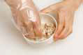 4. 소고기와 멸치가루와 달걀물, 빵가루, 다진 양송이버섯, 양파, 두부를 넣 고 치댄다.b