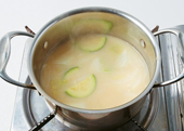 5. 육수에 된장을 풀고 다진 마늘, 호박, 양파, 단배추 순으로 넣어가며 끓인다.