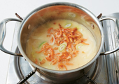 6. 끓으면 마른 새우, 대파를 넣어 살짝 더 끓여 마무리한다.