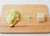3. 단배추는 5cm로 썰고, 대파는 어슷 썰고, 두부는 0.5cm 두께로 썬다.