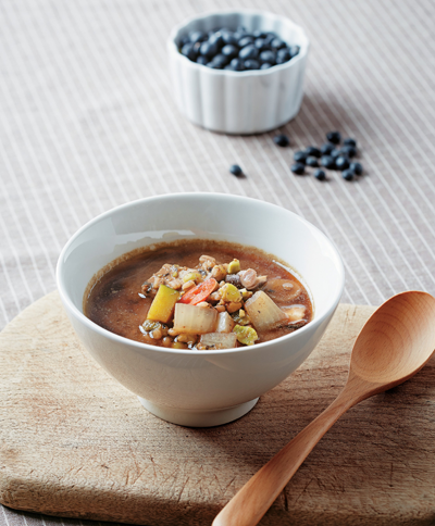6. 갈아놓은 검은콩을 넣어 농도를 맞춘 후 검은콩두부, 대파, 고추를 넣고 한소끔 끓여 마무리한다.