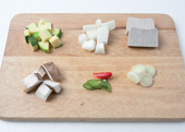4. 애호박, 양파, 검은콩두부, 표고버섯은 깍둑 썰고, 붉은 고추, 청양고추, 대파는 어슷하게 썬다.