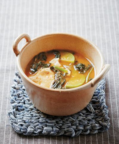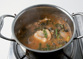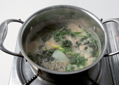 5. 저염재래된장을 육수에 풀고 곤드레나물, 고구마순, 취나물을 넣고 끓여 반 이상 익으면 애호박, 양파를 넣는다.