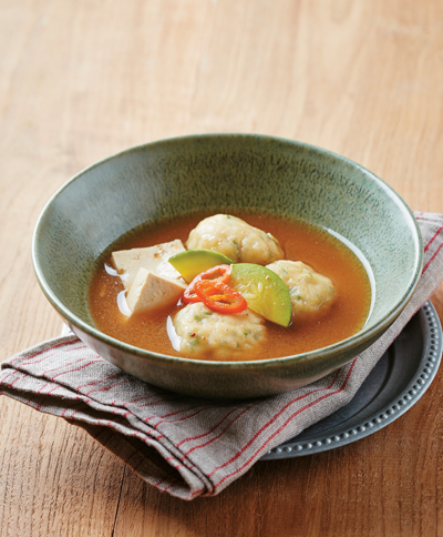 6. 굴림만두가 적당히 익으면 두부를 넣고 끓인 뒤 고추 고명을 얹어 마무리한다.