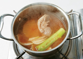육수 돼지고기(앞다리살, 100g), 무(70g), 양파(40g), 대파(40g)
