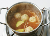4. 냄비에 저염된장을 제외한 육수 재료와 물을 넣고 끓어오르면 저염된장을 체에 내려 풀고 면포에 거른다.