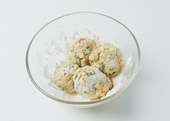1. 새송이버섯, 닭가슴살, 양파, 마늘, 부추는 잘게 다지고, 두부도 곱게 다진 뒤 물기를 제거한 후 간장을 넣고 함께 섞어 동그랗게 빚은 뒤 녹말가루와 밀가루를 섞어 반죽을 굴린다.
