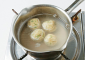 2. 차가운 물에 넣었다 뺀 뒤 가루에 굴리기를 2~3회 반복해 겉에 만두피가 코팅되면 끓는 물에 살짝 데친다.