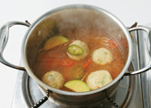 5. 육수에 굴림만두와 애호박, 팽이버섯을 넣고 끓인다.