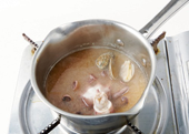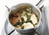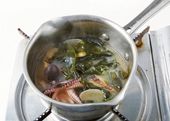 4. 육수에 된장을 풀고, 바지락과 주꾸미를 넣어 끓인다.